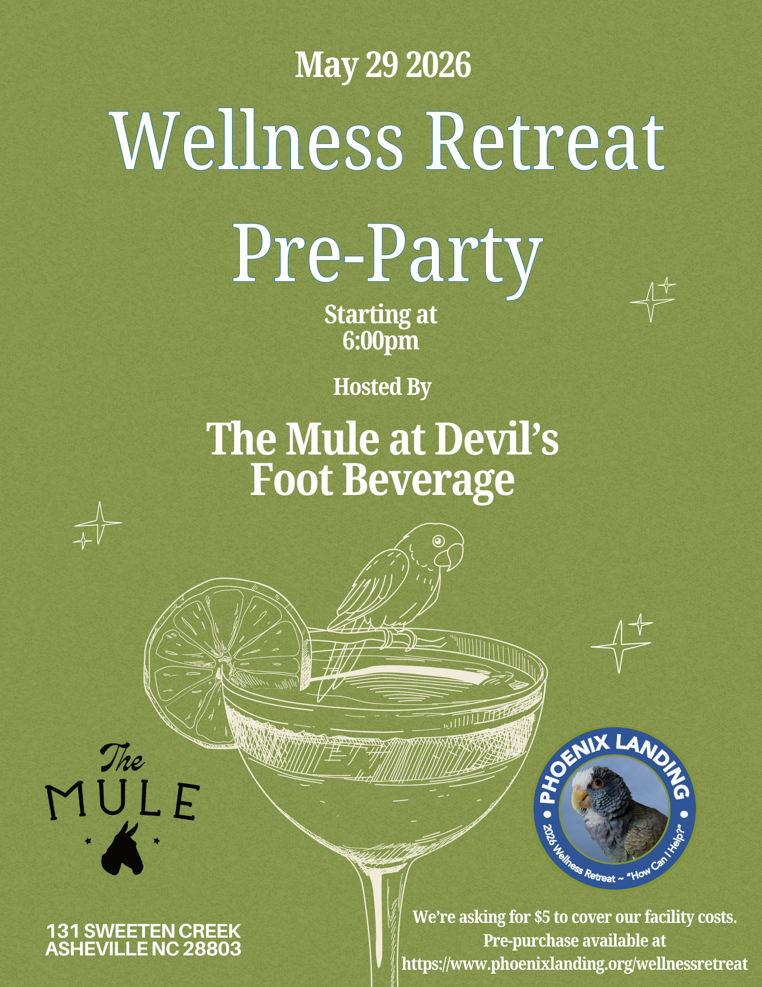 Phoenix Landing hosts their annual weekend wellness retreat and conference at UNCA, and we have the pleasure of hosting their welcome party! Phoenix Landing is a volunteer 501(c)(3) parrot welfare organization. They serve Maryland, Washington D.C., Virginia, North Carolina, and Northeast Florida through our parrot adoption program! Come learn more about them and maybe even meet some cute birdies!