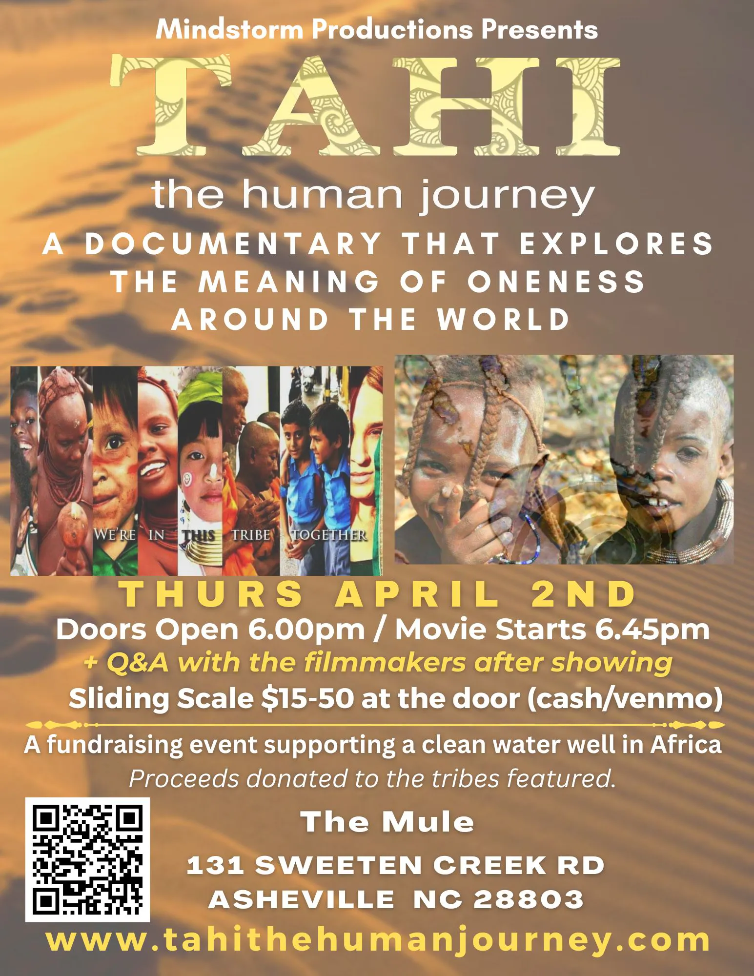 A Documentary That Explores Oneness Around The World Proceeds from this screening will directly benefit efforts to build a clean water well in Africa. Sliding Scale donation $15-$50 at the door. Visit their website to learn more! Tahi The Human Journey |