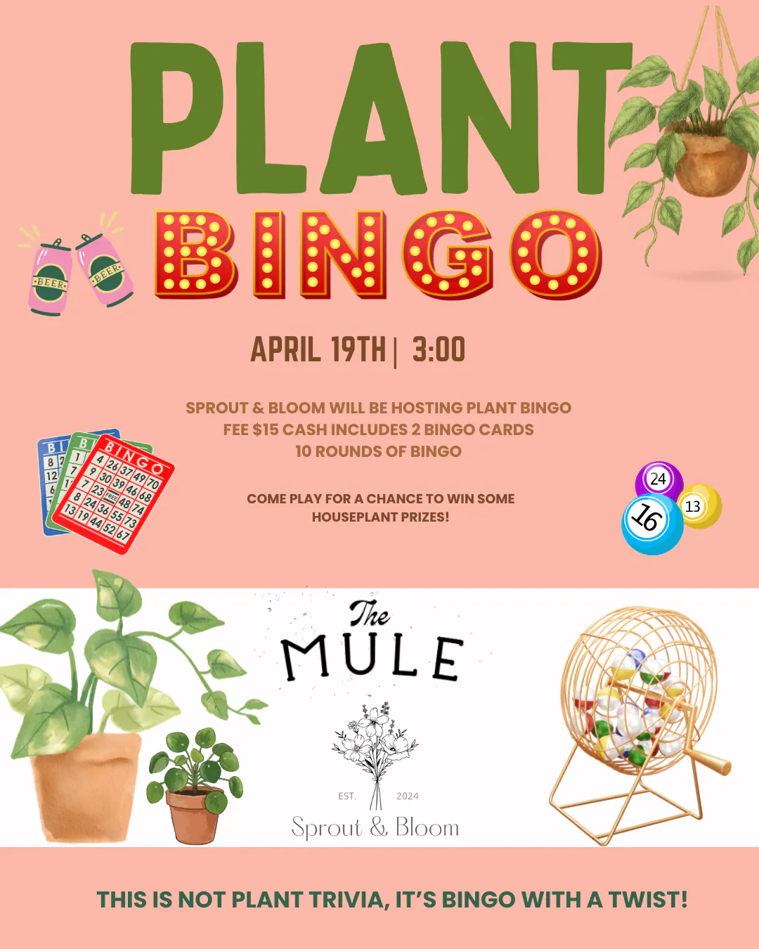 B-4 You Make Plans... You can win PLANTS! Join Sprout & Bloom for another addition of Plant Bingo! $15 to Play, 10 rounds of bingo! Drink Specials! All Ages! |