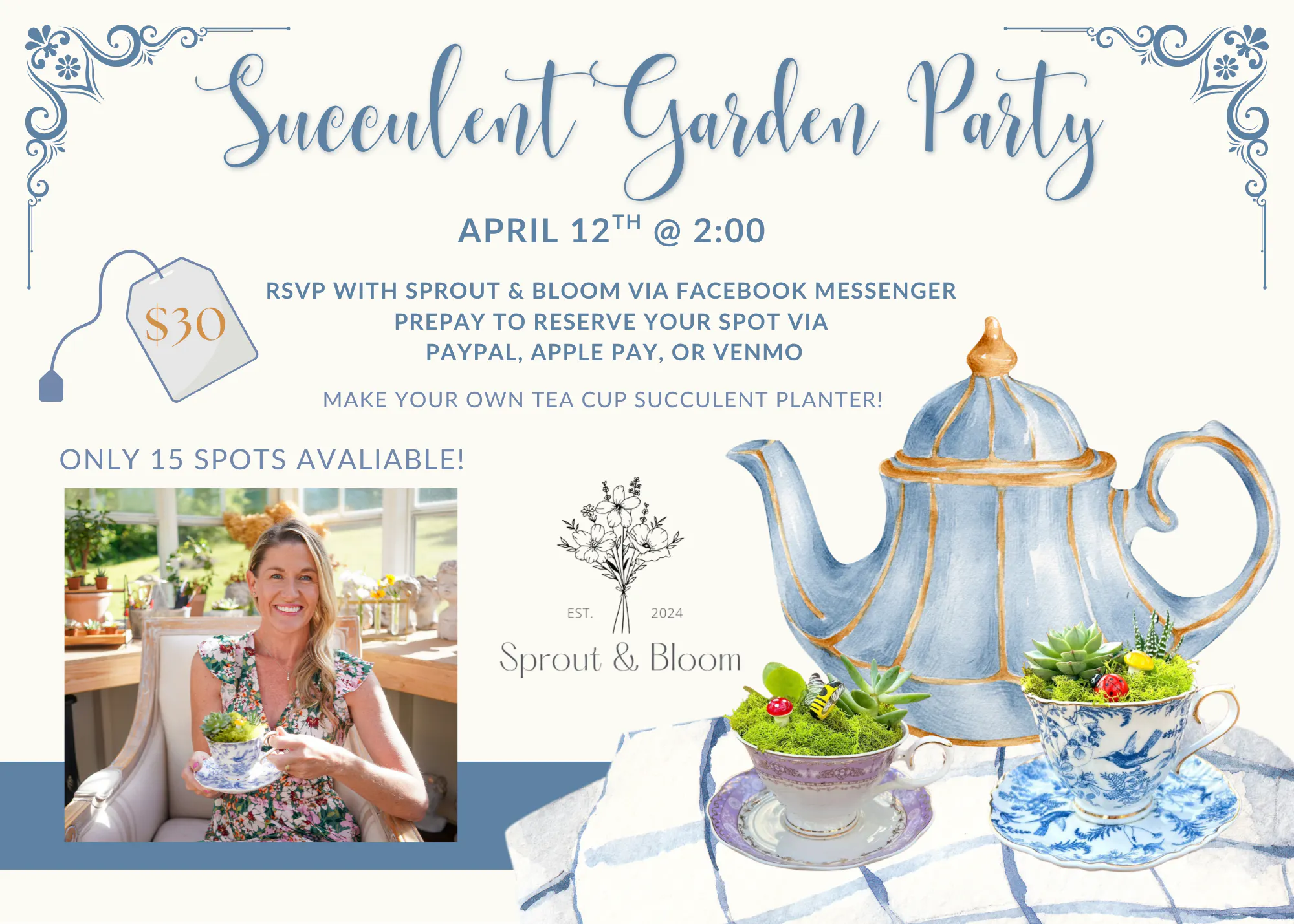 Spring is here, succulents are hardy... Let's have a tea party! Tea Cup Planter Workshop Join Courtney with Sprout & Bloom for a hands-on workshop and create your own Succulent Tea Cup Planter! Courtney will guide you step-by-step as you design and create your own planter. Cost: $30 What you'll get: * Stylish Tea Cup … Continued |