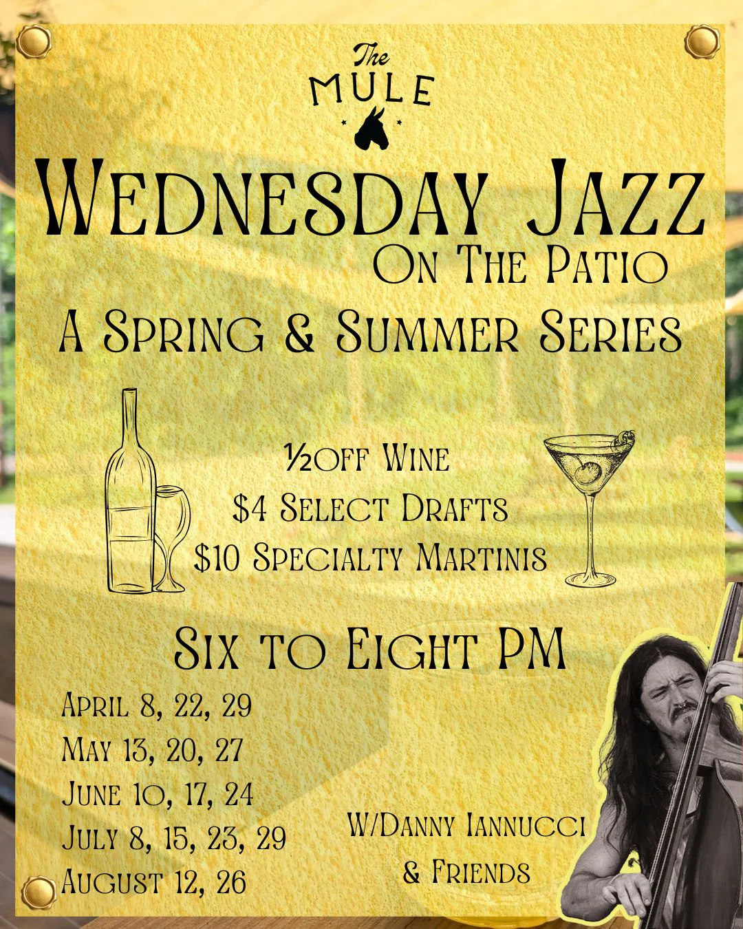 On The Patio Danny Iannucci & Friends are back for a Spring & Summer series of delightful jazz, delicious drink specials and your go-to mid-week wind down. Join us from 6-8p April-August to enjoy the fabulous jazz trio & 1/2 Off Wine, $10 Specialty Martinis, and $4 Select Craft Drafts. Free to attend and all … Continued |