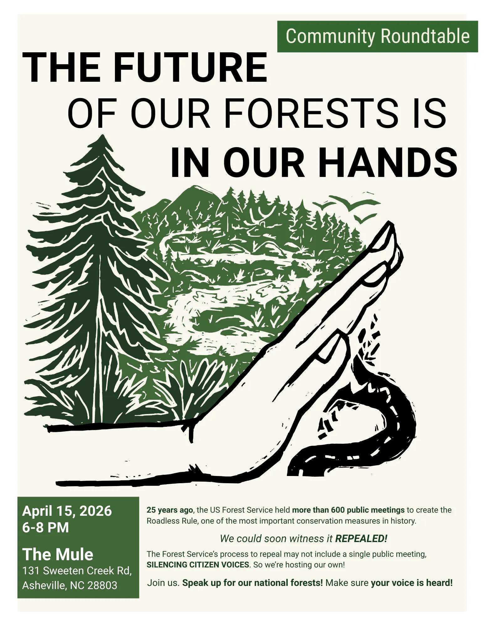 Join Local Conservation Efforts to Maintain The Roadless Rule This community led roundtable is an opportunity to learn more about how you can contribute to protecting our roadless lands. Free to attend and all are welcome! |