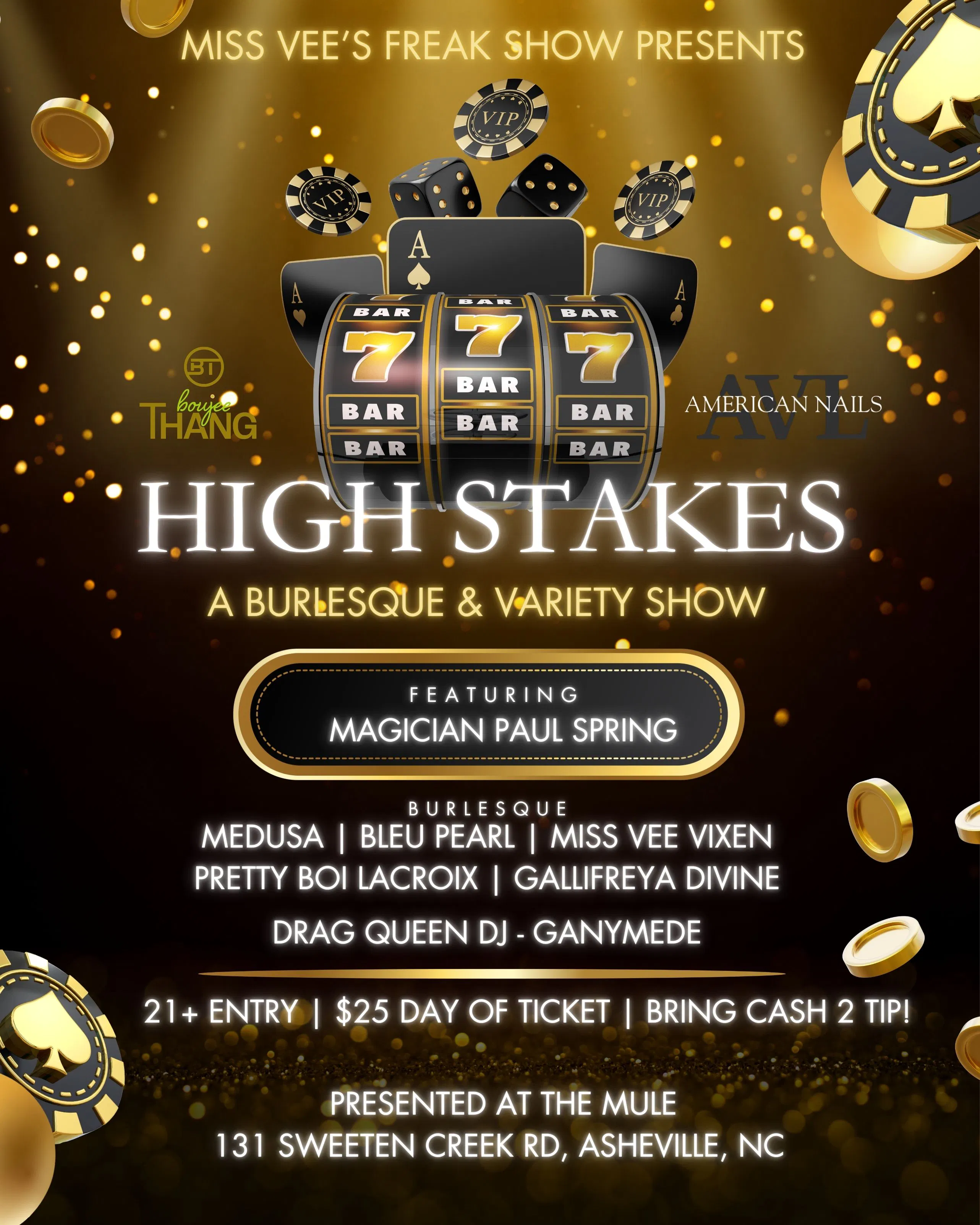Asheville's Favorite Monthly Burlesque & Variety Show at The Mule We're proud to be the home for Miss Vee's Freakshow. Prepare to be dazzled with an array of amazing local performers! Tickets are $25-$33 March "High Stakes" Tickets on Sale Now!