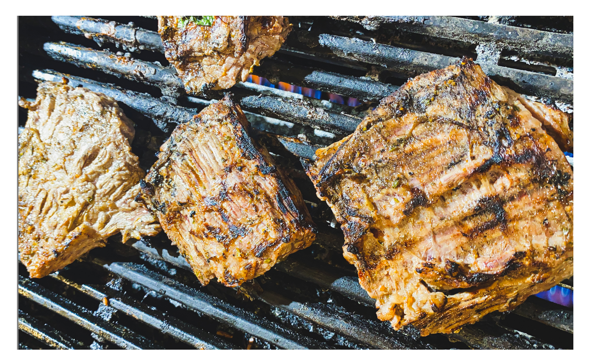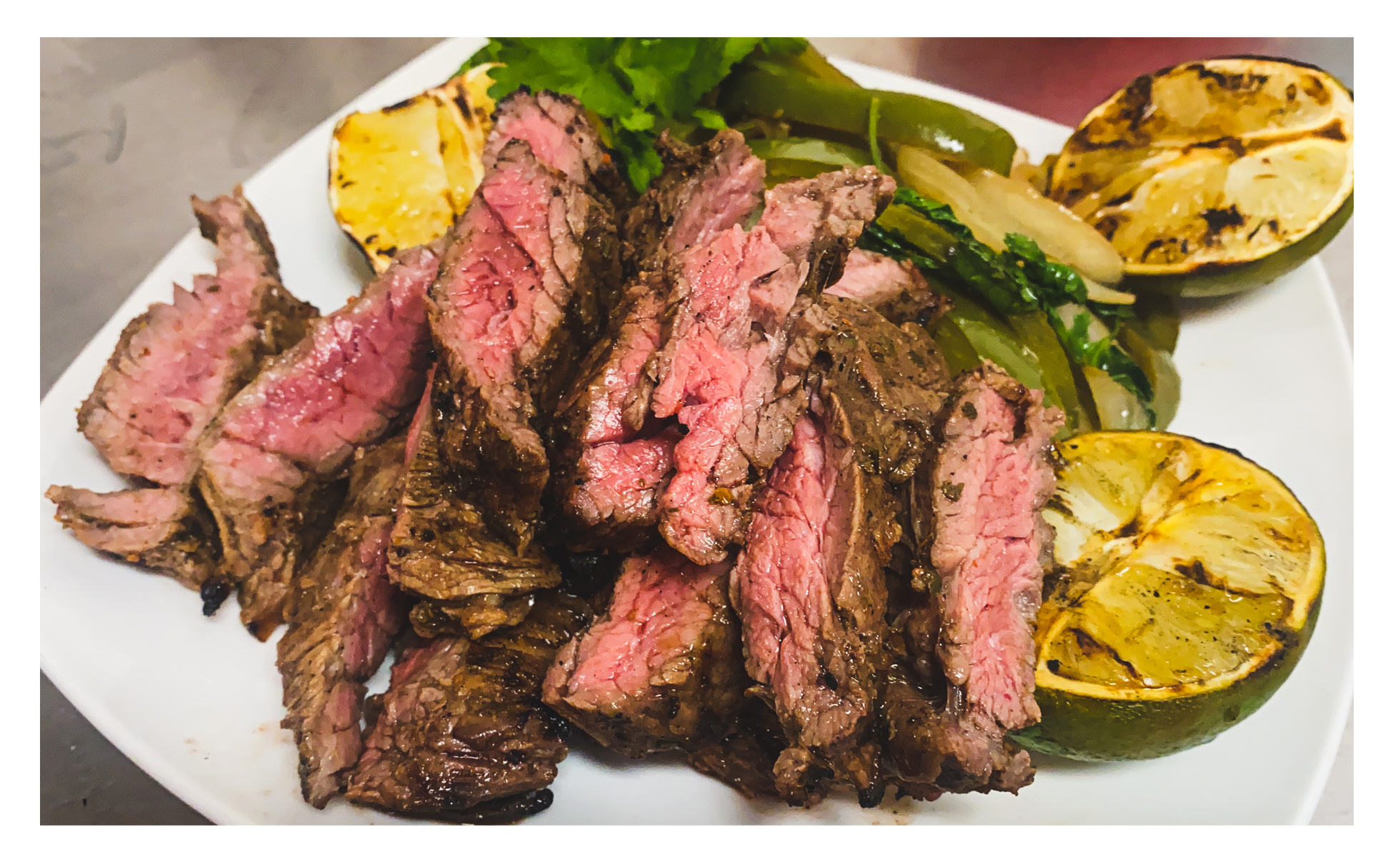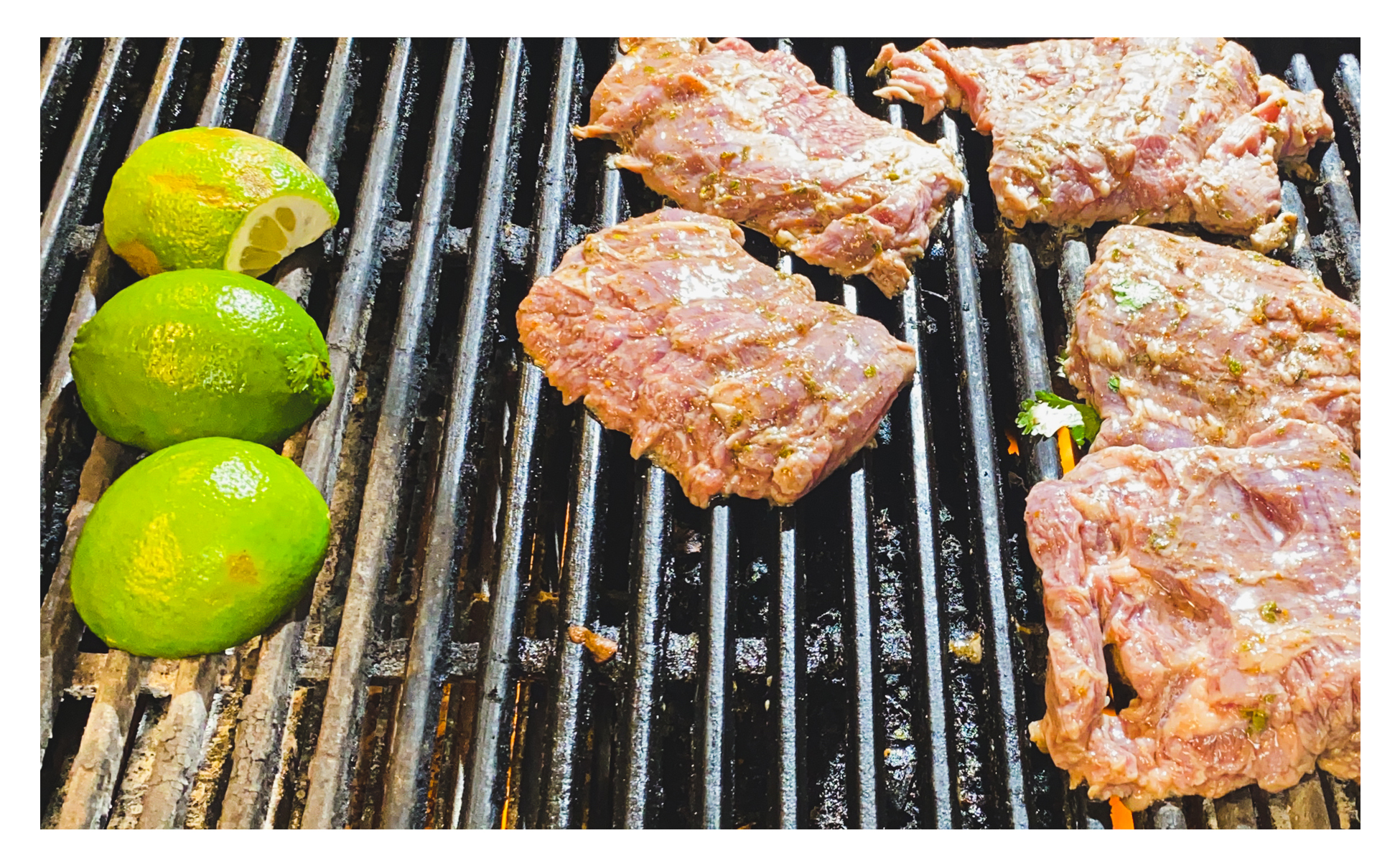 1. Marinate the Skirt Steak for 2 hours in Sparkling Limeade and Ginger Beer, cilantro and season liberally with Salt, Pepper, Cumin, and Chili Powder on both sides beforehand. Use enough soda just to cover the meat in whatever bowls, plastic containers or food storage bags you are using.