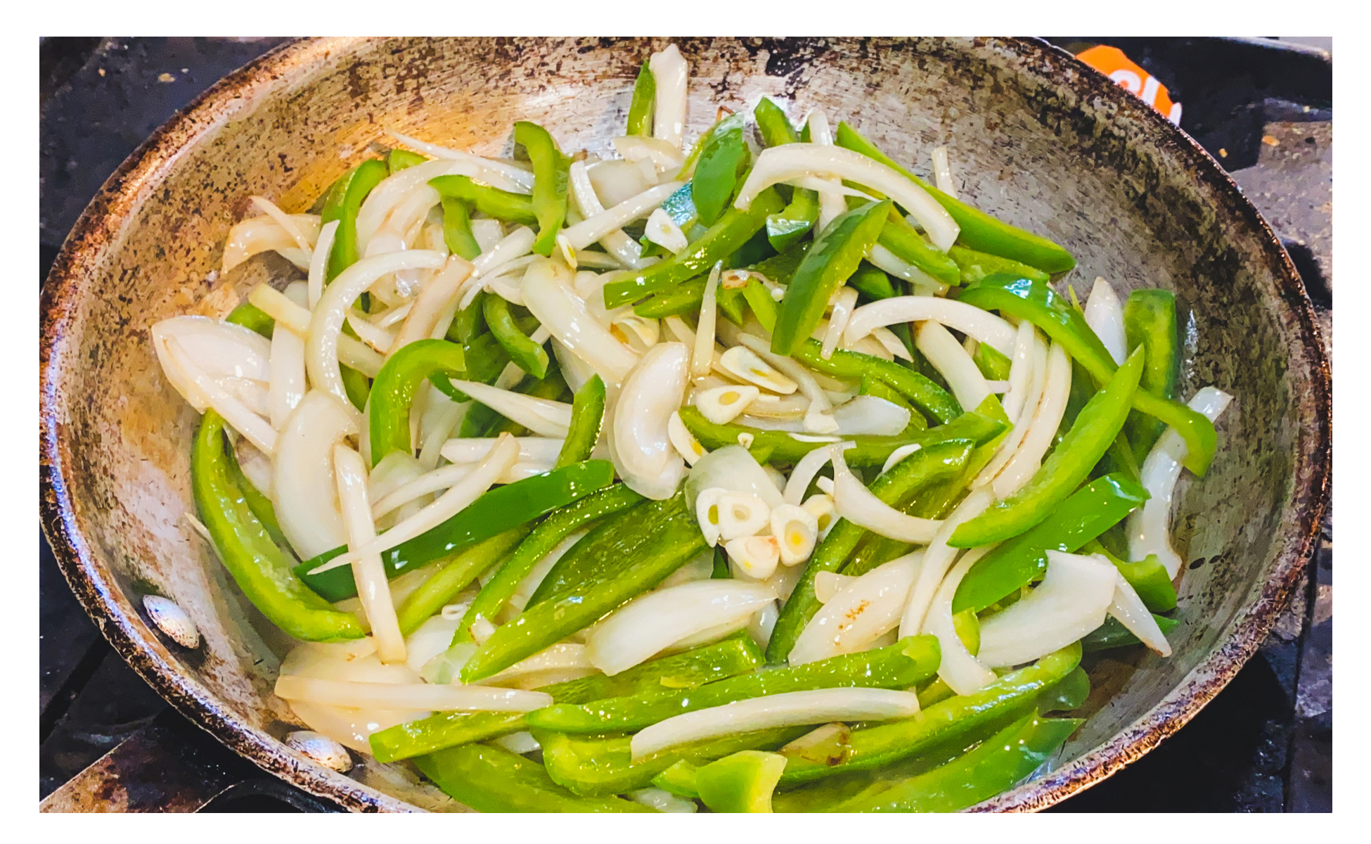 2. Slice Onions and Bell Peppers plus any other veggies you want….Squash, Zucchini, Mushrooms, Jalapeños, etc… and set aside for later.